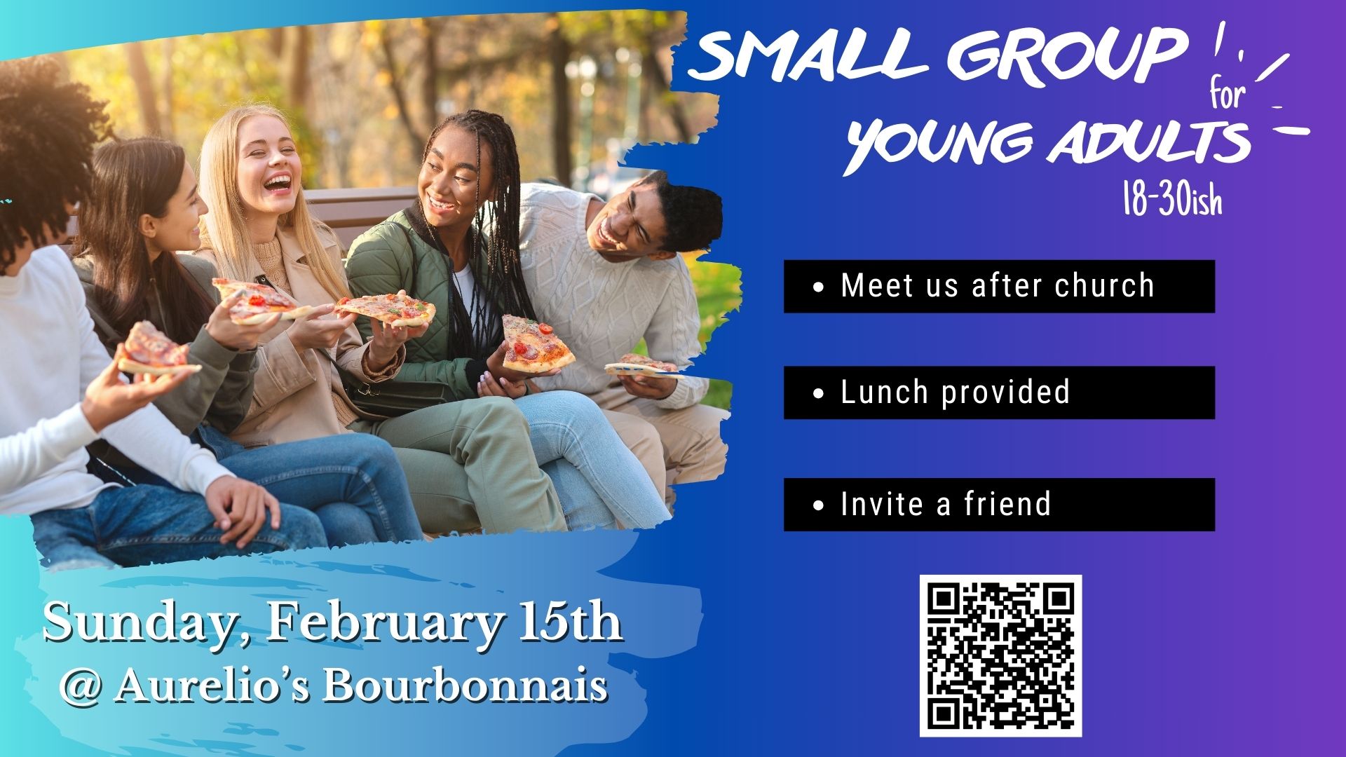 Young Adults 18-30ish join Pastor and Elaine for lunch and small group at Aurelio's Pizza! Invite a friend.  Lunch provided.